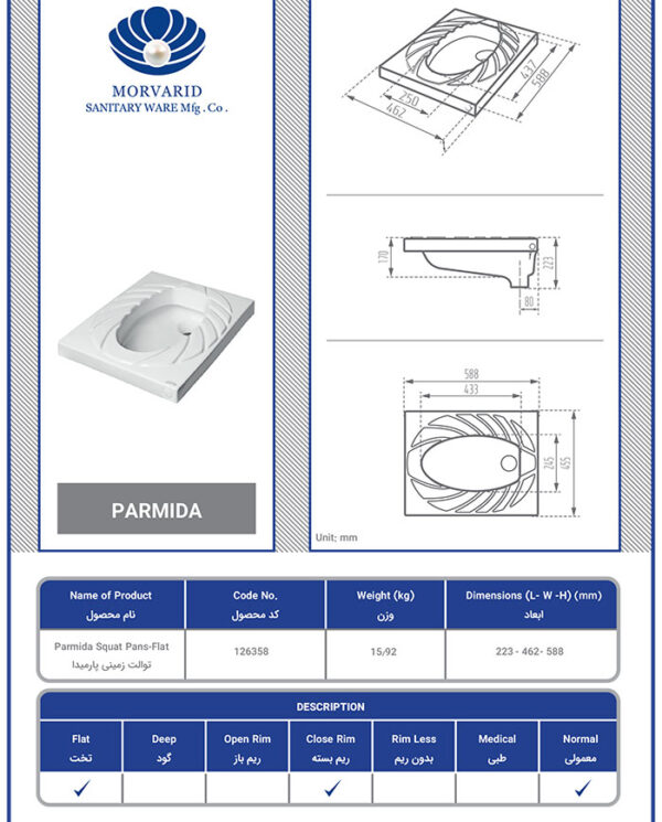 توالت زمینی مروارید مدل پارمیدا با ابعاد 22.3*46.2*58.8 سانتیمتر با وزن 15.3 کیلوگرم از نوع توالت زمینی تخت می باشد. این مدل توالت ایرانی در رده توالت های ریم بسته قرار می گیرد و همچنین سطحی صاف و براق دارد.
