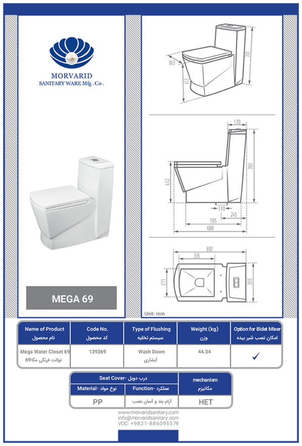 توالت فرنگی مگا مروارید سایز 69 با ابعاد طول: 69.2 سانتیمتر – عرض: 37.5 سانتیمتر – ارتفاع: 70.1 سانتیمتر – وزن: 48 کیلوگرم تولید می گردد. این توالت فرنگی از محصولات پرطرفدار چینی بهداشتی مروارید با طراحی کاملا یکپارچه و ساده به سبک مدرن به همراه سیستم تخلیه آبشاری می باشد.