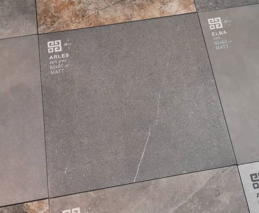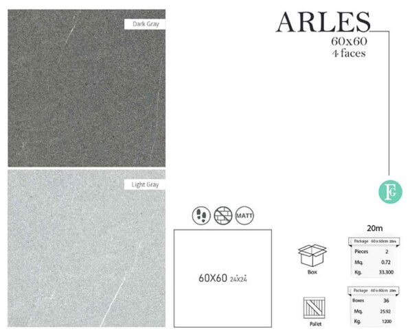 سرامیک آرلس فخار 60 در 60 پرسلان مات 20 میلیمتر دارای تلفیقی از طرح سمنت و طرح سنگ در رنگ های طوسی روشن و طوسی تیره می باشد. خاک استفاده شده در بدنه این سرامیک خاک سفید پرسلانی می باشد و جذب آب پایین تر و مقاوت بالاتری نسبت به خاک قرمز دارد.