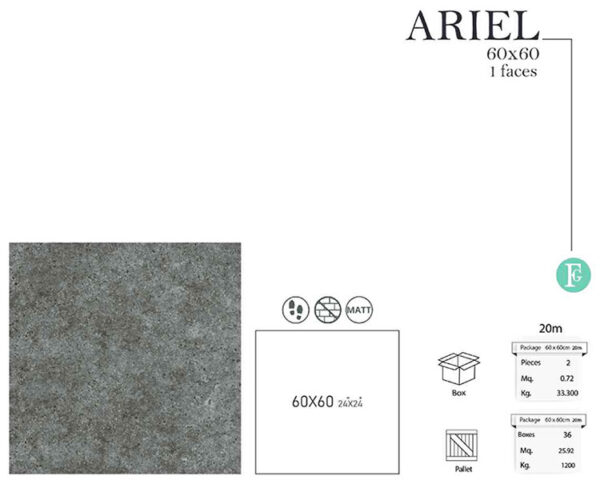 سرامیک آریل فخار 60 در 60 پرسلان مات 20 میلیمتر برگرفته از طرح سمنت و بتن زیبا و چشم نواز با رنگ طوسی تیره می باشد. خاک استفاده شده در بدنه این سرامیک خاک سفید پرسلانی می باشد و جذب آب پایین تر و مقاوت بالاتری نسبت به خاک قرمز دارد.