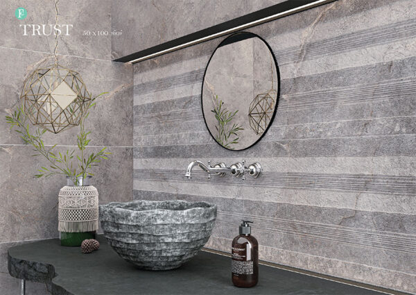 سرامیک تراست فخار رفسنجان 50 در 100 پرسلان مات برگرفته از طرح سنگ با رنگ استخوانی، کرم و طوسی و مدل دکور کرکره ای می باشد. خاک استفاده شده در بدنه این سرامیک خاک سفید می باشد و جذب آب پایین تر و مقاوت بالاتری نسبت به خاک قرمز دارد.