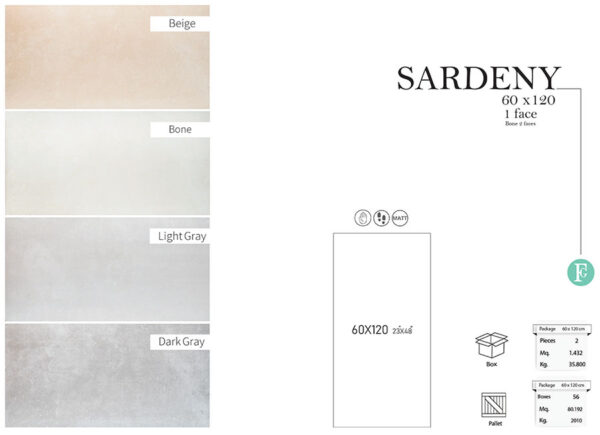 سرامیک ساردنی فخار 60 در 120 پرسلان مات برگرفته از طرح سمنت یا سیمان در رنگ های طوسی روشن، طوسی تیره، استخوانی و بژ می باشد. خاک استفاده شده در بدنه این سرامیک خاک سفید پرسلانی می باشد و جذب آب پایین تر و مقاوت بالاتری نسبت به خاک قرمز دارد.