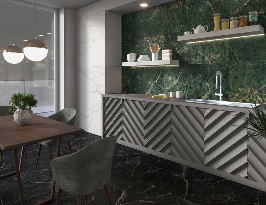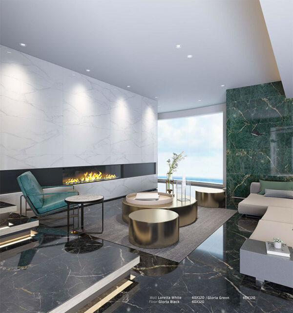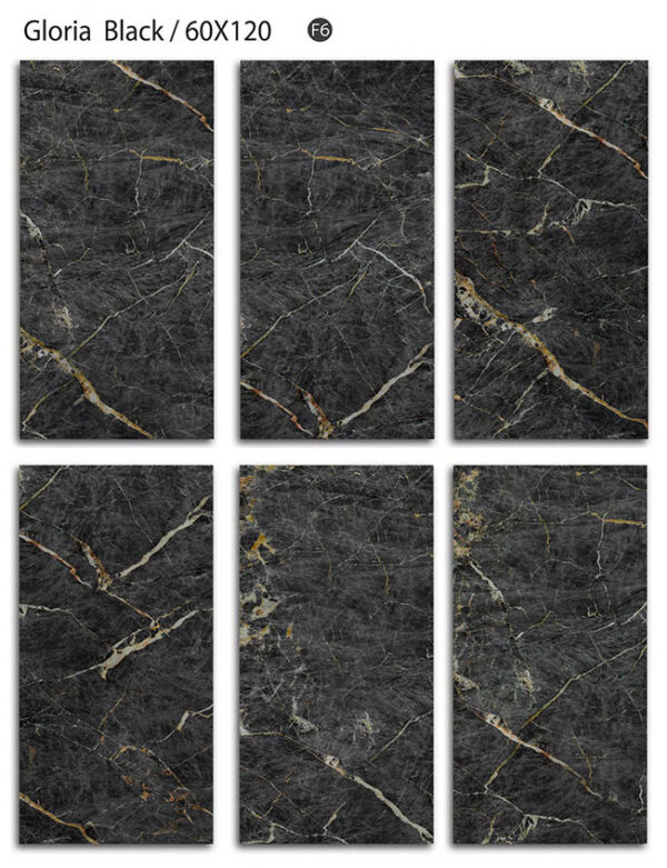 سرامیک گلوریا هرمس تبریز 60 در 120 پرسلان مات و فول پولیش دارای طرح سنگ مشکی و سبز یشمی با رگه های طلایی زیبا و جذاب معروف به طرح سنگ گلدن بلک و طرح سنگ مرمر می باشد. خاک استفاده شده در بدنه این سرامیک خاک سفید پرسلانی می باشد و جذب آب پایین تر و مقاوت بالاتری نسبت به خاک قرمز دارد.