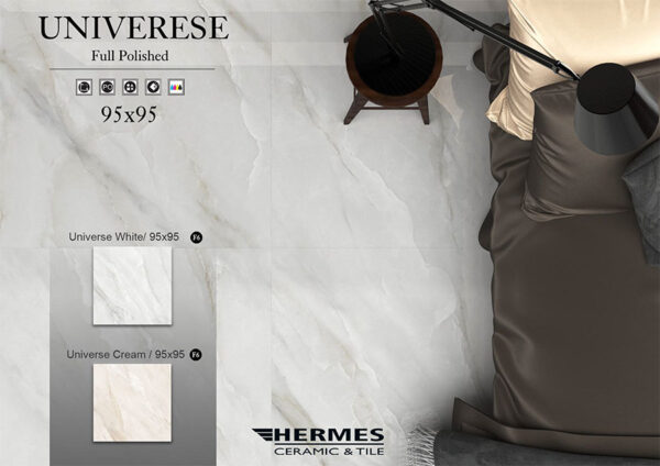 سرامیک یونیورس هرمس تبریز 95 در 95 پرسلان فول پولیش و مات دارای طرح سنگ مرمر زیبا و جذاب در رنگ های سفید و کرم می باشد. خاک استفاده شده در بدنه این سرامیک خاک سفید پرسلانی می باشد و جذب آب پایین تر و مقاوت بالاتری نسبت به خاک قرمز دارد.