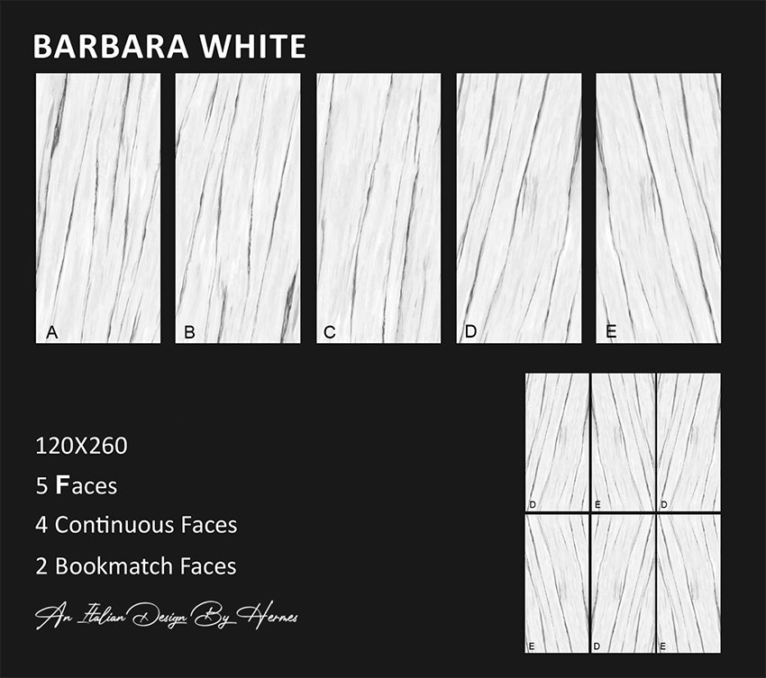 اسلب باربارا هرمس تبریز 120 در 260 پرسلان مات کاروینگ افکت دارای طرح پاندا یا طرح سنگ کلکته با رنگ سفید و رگه های مشکی طوسی در پنج فیس  می باشد. خاک استفاده شده در بدنه این سرامیک خاک سفید پرسلانی می باشد و جذب آب پایین تر و مقاوت بالاتری نسبت به خاک قرمز دارد.