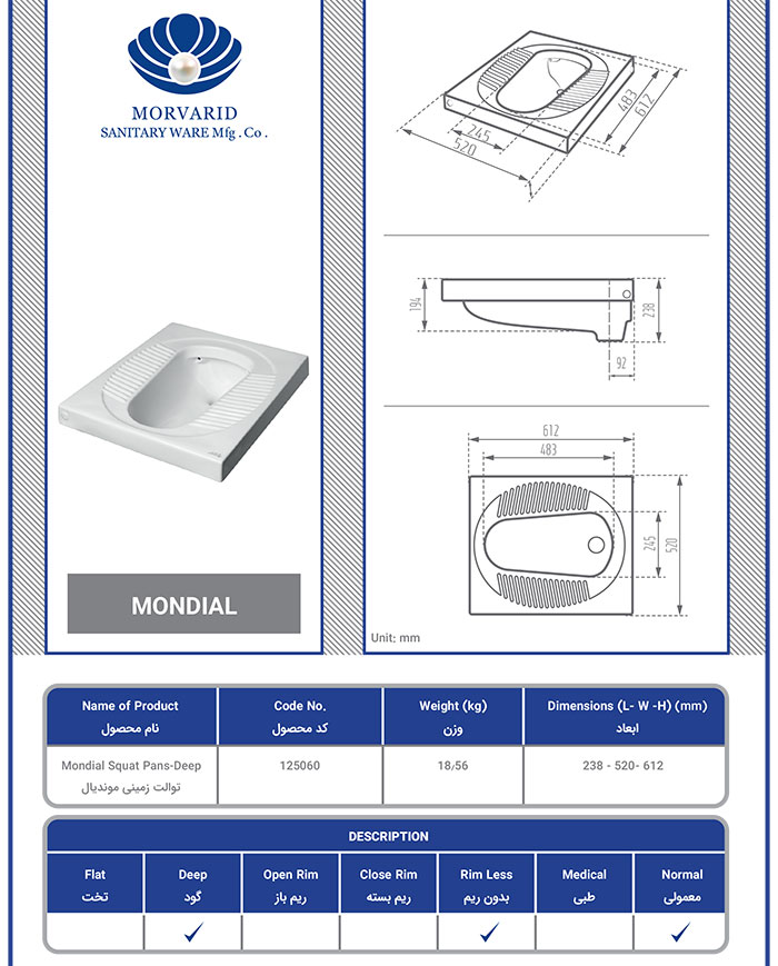توالت زمینی طوسی مروارید مدل موندیال با ابعاد 23.8*52*61.2 سانتیمتر با وزن 18.5 کیلوگرم از نوع توالت زمینی گود می باشد. این مدل توالت ایرانی در رده توالت های ریم لس قرار می گیرد و همچنین سطحی صاف و مات دارد.