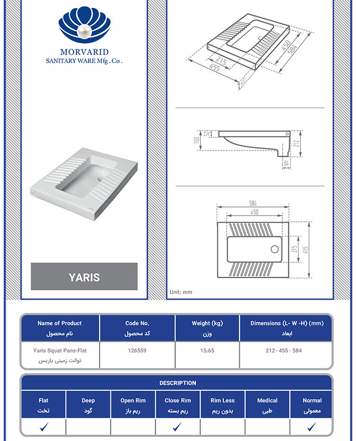 توالت زمینی مروارید مدل یاریس با ابعاد 21.2*45.5*58.4 سانتیمتر با وزن 15.4 کیلوگرم از نوع توالت زمینی تخت می باشد. این مدل توالت ایرانی در رده توالت های ریم بسته قرار می گیرد و همچنین سطحی صاف و براق دارد.