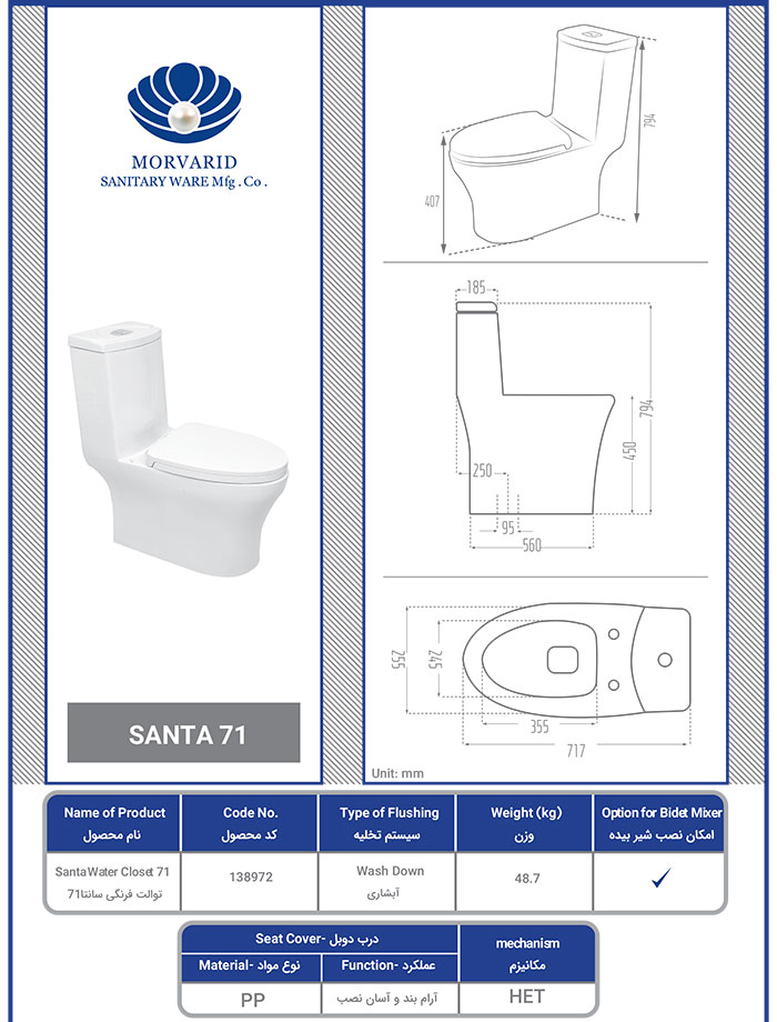 درجه ساخت و کیفیت توالت فرنگی مروارید مدل سانتا