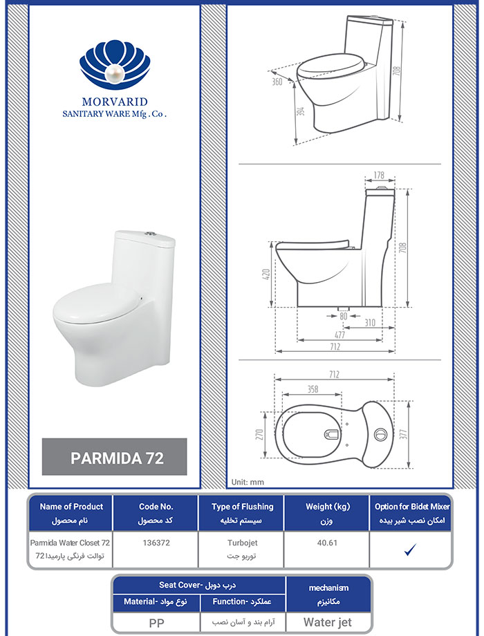 توالت فرنگی پارمیدا مروارید سایز 72 با ابعاد طول: 71.2 سانتیمتر – عرض: 40.3 سانتیمتر – ارتفاع: 70.8 سانتیمتر – وزن: 37.3 کیلوگرم تولید می گردد. این محصول با طراحی ساده و هوشمندانه و با ظرافت خود روی مخزن و کاسه و القای حس سادگی و مدرن یکی از برترین انتخاب های مشتریان است.