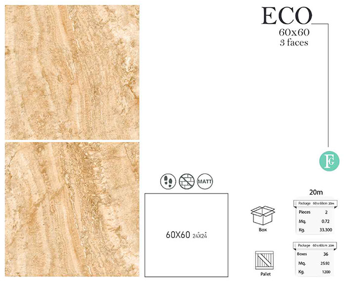 سرامیک اکو فخار 60 در 60 پرسلان مات 20 میلیمتر دارای طرح سنگ تراورتن با رنگ کرم قهوه ای می باشد. خاک استفاده شده در بدنه این سرامیک خاک سفید پرسلانی می باشد و جذب آب پایین تر و مقاوت بالاتری نسبت به خاک قرمز دارد.