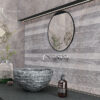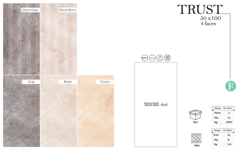 سرامیک تراست فخار رفسنجان 50 در 100 پرسلان مات برگرفته از طرح سنگ با رنگ استخوانی، کرم و طوسی و مدل دکور کرکره ای می باشد. خاک استفاده شده در بدنه این سرامیک خاک سفید می باشد و جذب آب پایین تر و مقاوت بالاتری نسبت به خاک قرمز دارد.