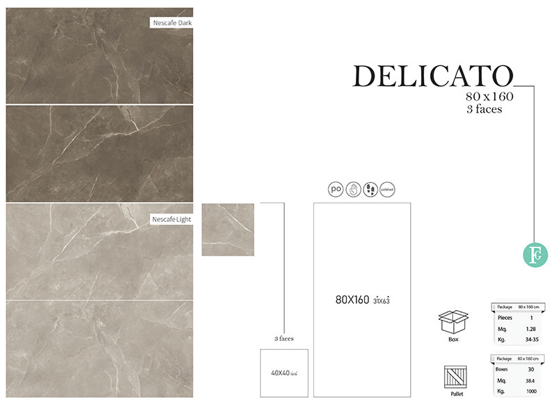 سرامیک دلیکاتو فخار 80 در 160 پرسلان فول پولیش دارای طرح سنگ لاشتر زیبا و چشم نواز در رنگ های نسکافه ای روشن و تیره می باشد. خاک استفاده شده در بدنه این سرامیک خاک سفید پرسلانی می باشد و جذب آب پایین تر و مقاوت بالاتری نسبت به خاک قرمز دارد.