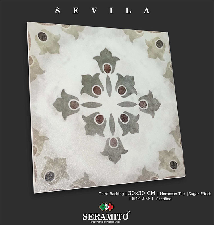 سرامیک سویلا سرامیتو 30 در 30 پرسلان مات شوگر افکت دارای طرح مراکشی، سنتی گل دار با جلوه ایی خاص و جذاب با تلفیقی از رنگ های استخوانی، یشمی و قهوه ای می باشد. خاک استفاده شده در بدنه این سرامیک خاک سفید پرسلانی می باشد و جذب آب پایین تر و مقاوت بالاتری نسبت به خاک قرمز دارد.