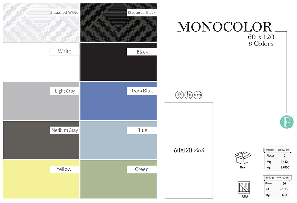 سرامیک مونوکالر فخار 60 در 120 پرسلان مات دارای طرح ساده در رنگ های سفید، آبی روشن، آبی تیره، طوسی، طوسی روشن، سبز و مشکی می باشد. خاک استفاده شده در بدنه این سرامیک خاک سفید پرسلانی می باشد و جذب آب پایین تر و مقاوت بالاتری نسبت به خاک قرمز دارد.