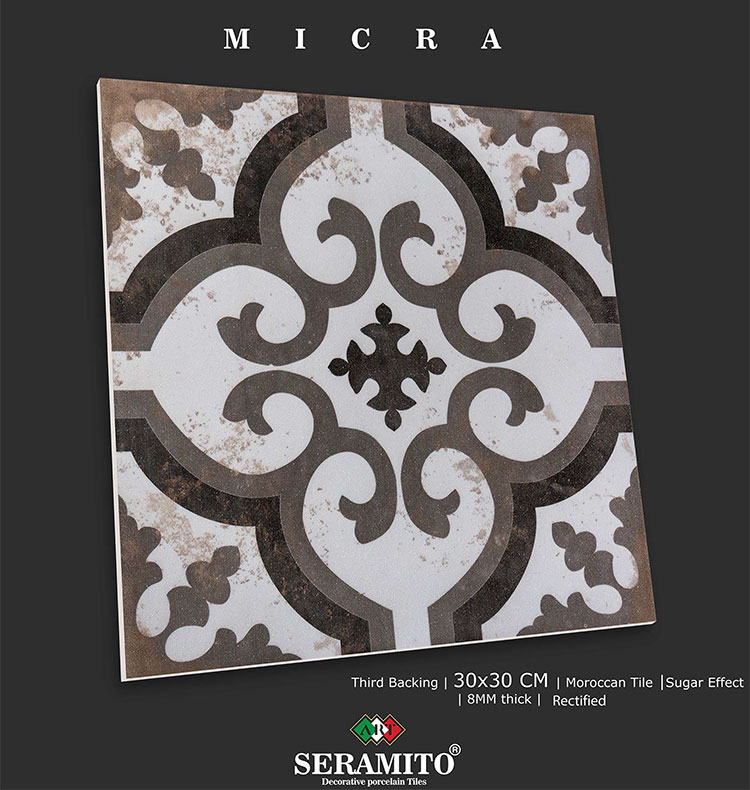 سرامیک میکرا سرامیتو 30 در 30 پرسلان مات شوگر افکت دارای طرح مراکشی، سنتی گل دار با تلفیقی از رنگ های طوسی و قهوه ای می باشد. خاک استفاده شده در بدنه این سرامیک خاک سفید پرسلانی می باشد و جذب آب پایین تر و مقاوت بالاتری نسبت به خاک قرمز دارد.