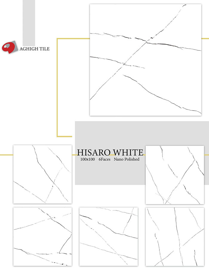 سرامیک هیسارو عقیق 100 در 100 پرسلان نانو پولیش برگرفته از طرح سنگ کلکته و پاندا با رنگ سفید و رگه های مشکی می باشد. خاک استفاده شده در بدنه این سرامیک خاک سفید پرسلانی می باشد و جذب آب پایین تر و مقاوت بالاتری نسبت به خاک قرمز دارد.
