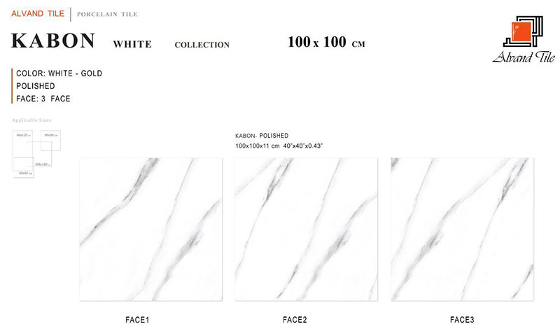 سرامیک کابن الوند 100 در 100 پرسلان فول پولیش دارای طرح سنگ کلکته در دو رنگ سفید با رگه های طلایی و سفید با رگه های طوسی می باشد. خاک استفاده شده در بدنه این سرامیک خاک سفید پرسلانی می باشد و جذب آب پایین تر و مقاوت بالاتری نسبت به خاک قرمز دارد.