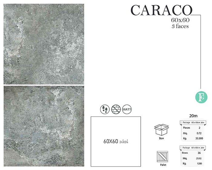 سرامیک کاراکو فخار 60 در 60 پرسلان مات 20 میلیمتر با تلفیقی از طرح بتن و طرح سمنت زیبا و خاص با رنگ طوسی تیره می باشد. خاک استفاده شده در بدنه این سرامیک خاک سفید پرسلانی می باشد و جذب آب پایین تر و مقاوت بالاتری نسبت به خاک قرمز دارد.