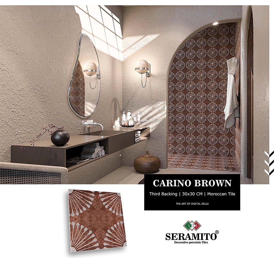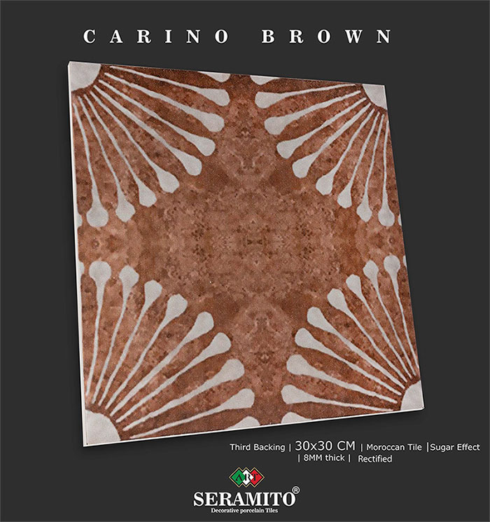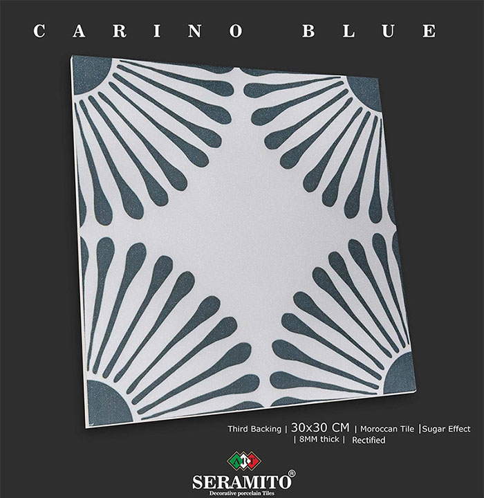 سرامیک کارینو سرامیتو 30 در 30 پرسلان مات شوگر افکت دارای طرح سنتی زیبا و خاص و در رنگ های آبی و قهوه ای می باشد. خاک استفاده شده در بدنه این سرامیک خاک سفید پرسلانی می باشد و جذب آب پایین تر و مقاوت بالاتری نسبت به خاک قرمز دارد.