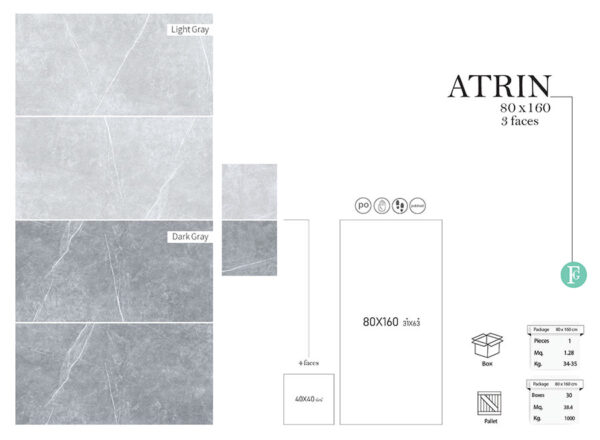 سرامیک 80 در 160 آترین فخار پرسلان فول پولیش دارای طرح سنگ لاشتر در رنگ های طوسی روشن و طوسی تیره می باشد. خاک استفاده شده در بدنه این سرامیک خاک سفید پرسلانی می باشد و جذب آب پایین تر و مقاوت بالاتری نسبت به خاک قرمز دارد.