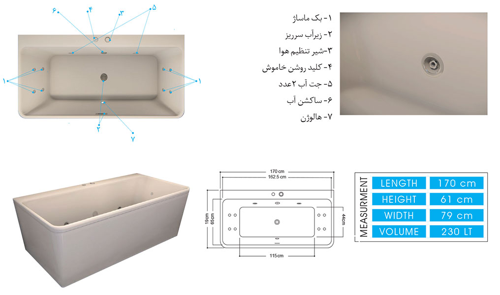 این محصول یکی از مدل های وان جکوزی یک نفره شرکت سای تک می باشد. حجم آب این وان 230 لیتر می باشد.
