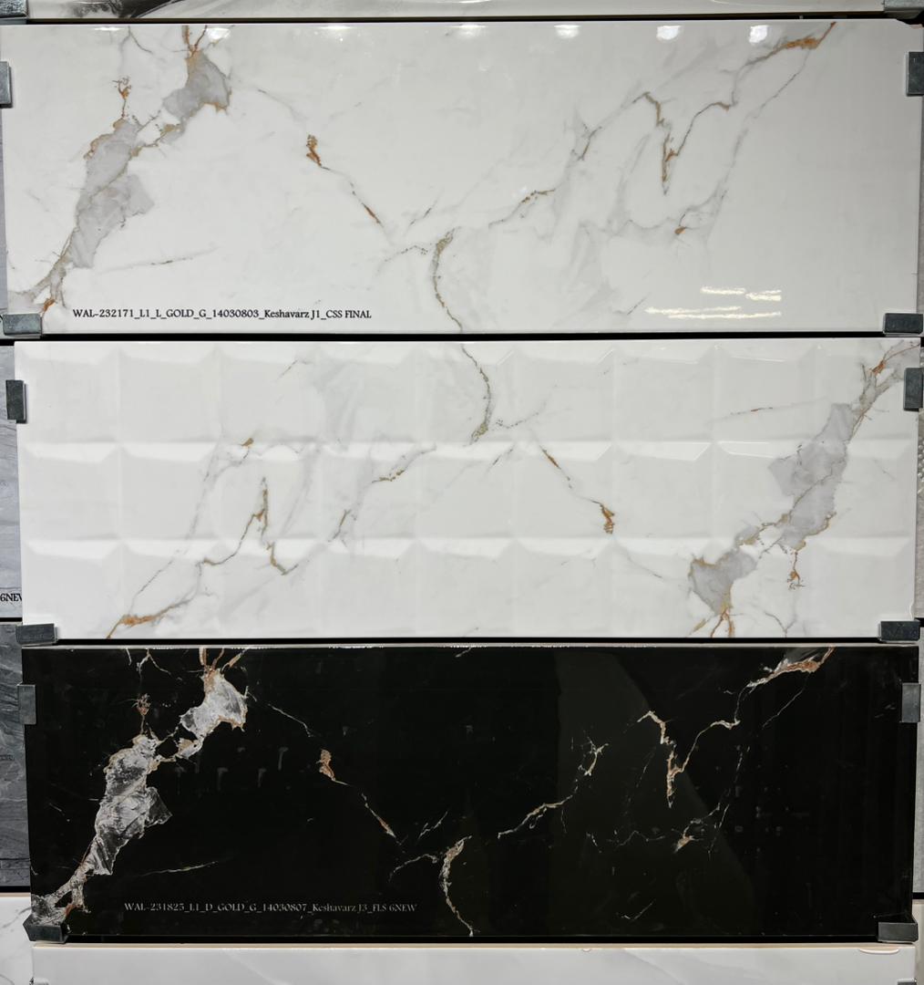 کاشی آلیسا الوند 30 در 90 براق دارای طرح سنگ کلکته گلد سفید و مشکی در مدل ساده و طرح کلکته دکور مربعی می باشد. خاک استفاده شده در بدنه این سرامیک خاک سفید پرسلانی می باشد و جذب آب پایین تر و مقاوت بالاتری نسبت به خاک قرمز دارد.