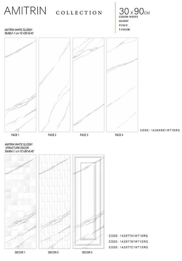 کاشی آمیترین الوند 30 در 90 براق دارای طرح سنگ کلکته سفید با رگه های طوسی در دو مدل ساده و دکور مربعی برجسته می باشد. خاک استفاده شده در بدنه این سرامیک خاک سفید پرسلانی می باشد و جذب آب پایین تر و مقاوت بالاتری نسبت به خاک قرمز دارد.
