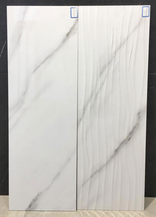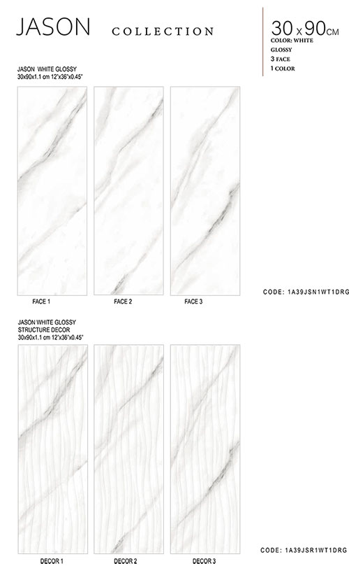 کاشی جیسون الوند 30 در 90 براق دارای طرح سنگ کلکته سفید با رگه های طوسی در دو مدل ساده و دکور موج دار برجسته می باشد. خاک استفاده شده در بدنه این سرامیک خاک سفید پرسلانی می باشد و جذب آب پایین تر و مقاوت بالاتری نسبت به خاک قرمز دارد.