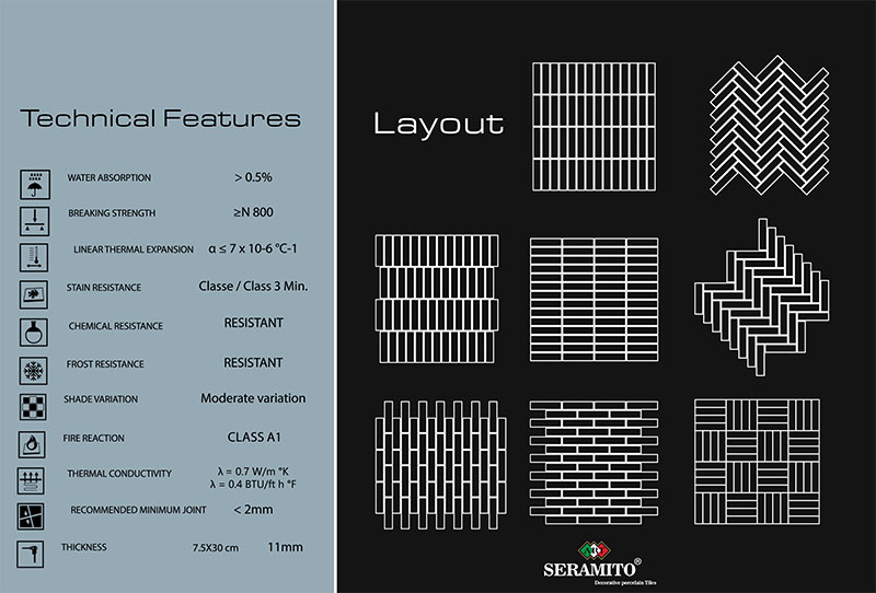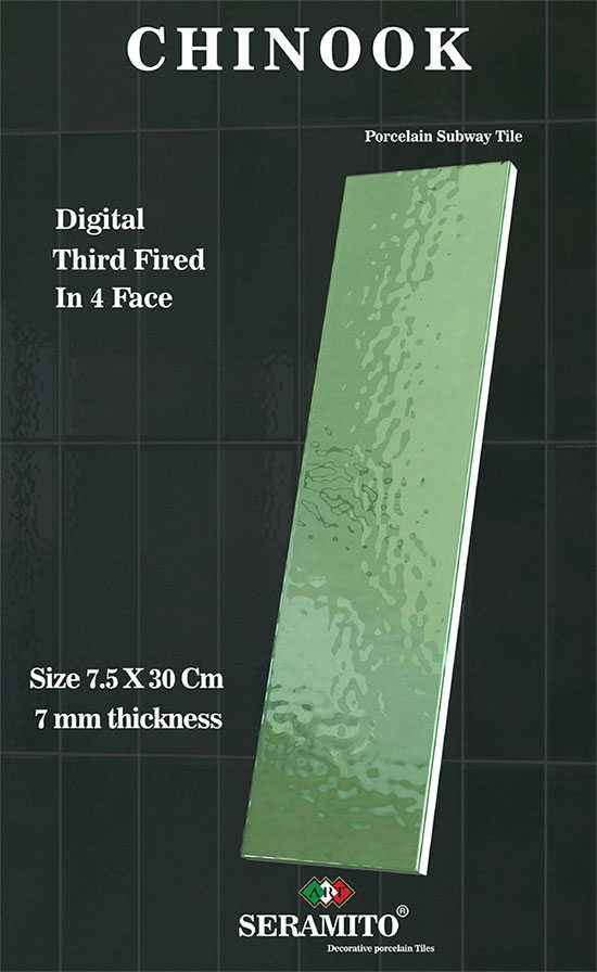 کاشی مترویی چینوک سرامیتو 7.5 در 30 پرسلان براق برگرفته از طرح مترویی و آجر با رنگ سبز مغز پسته ایی می باشد. خاک استفاده شده در بدنه این سرامیک خاک سفید پرسلانی می باشد و جذب آب پایین تر و مقاوت بالاتری نسبت به خاک قرمز دارد.